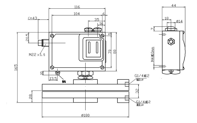520M/7DD防爆差壓開關(guān)外形尺寸及安裝尺寸(單位:mm)