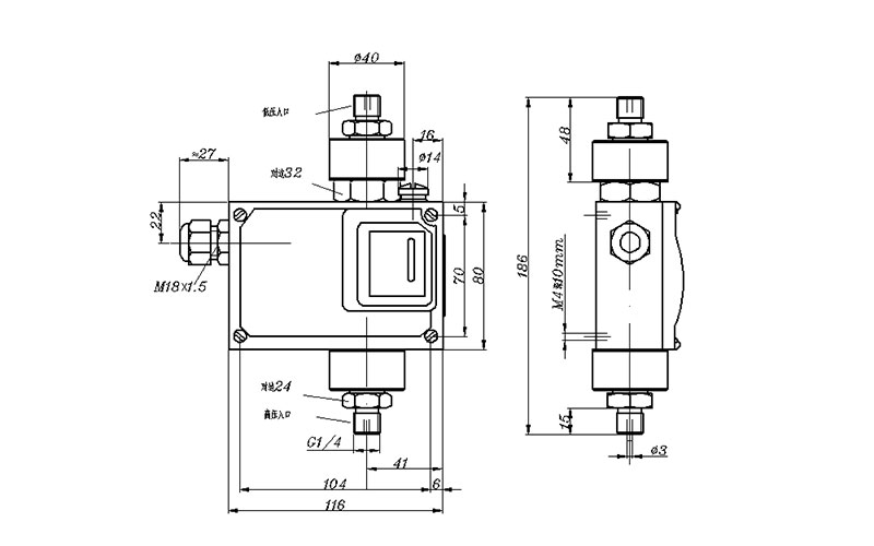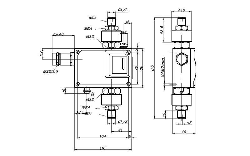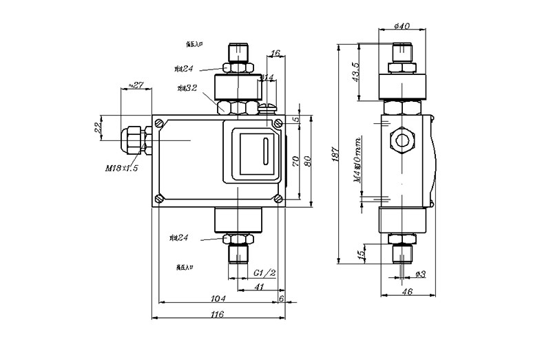 540/7DD防爆差壓開關(guān)外形尺寸及安裝尺寸(單位:mm)